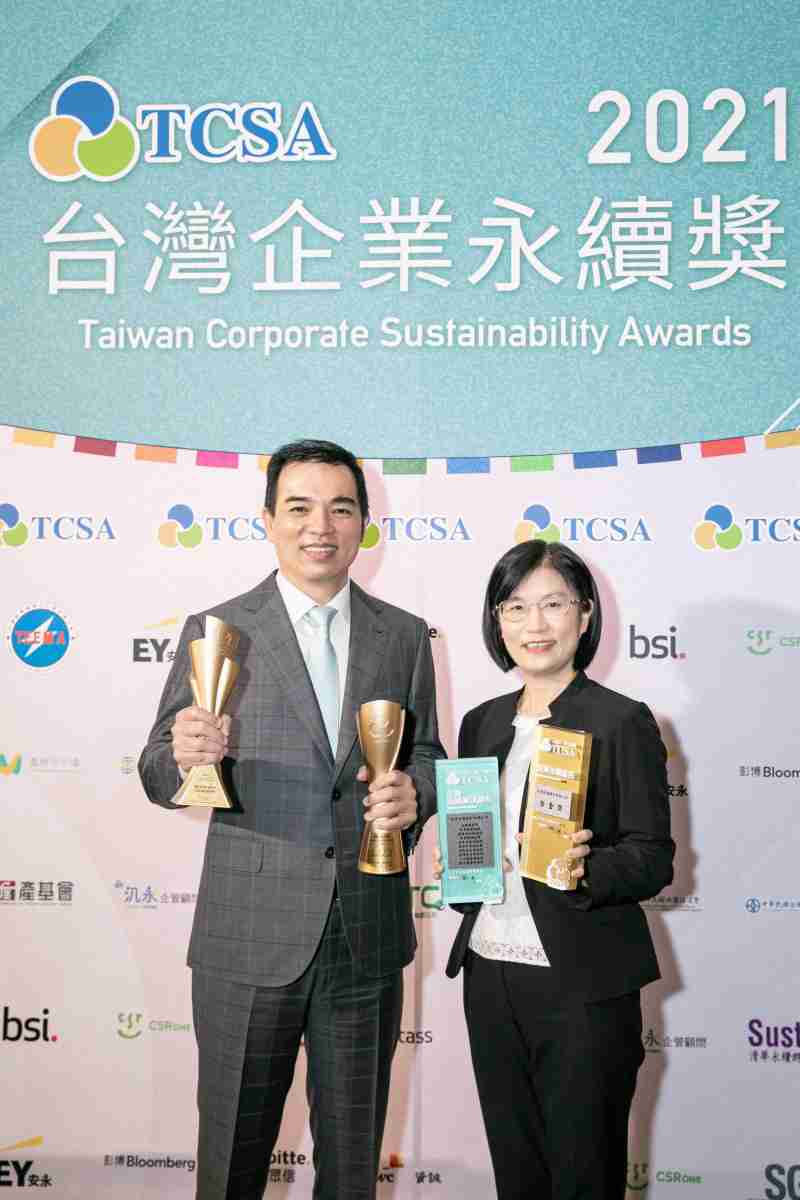 达在台湾永续奖所评比环境、、、、社会、、、治理等各面向的永续绩效均获高度肯定 (左:888.BY集团电子游戏光电总经理暨营运长柯富仁,,,,右:888.BY集团电子游戏光电永续长古秀华)