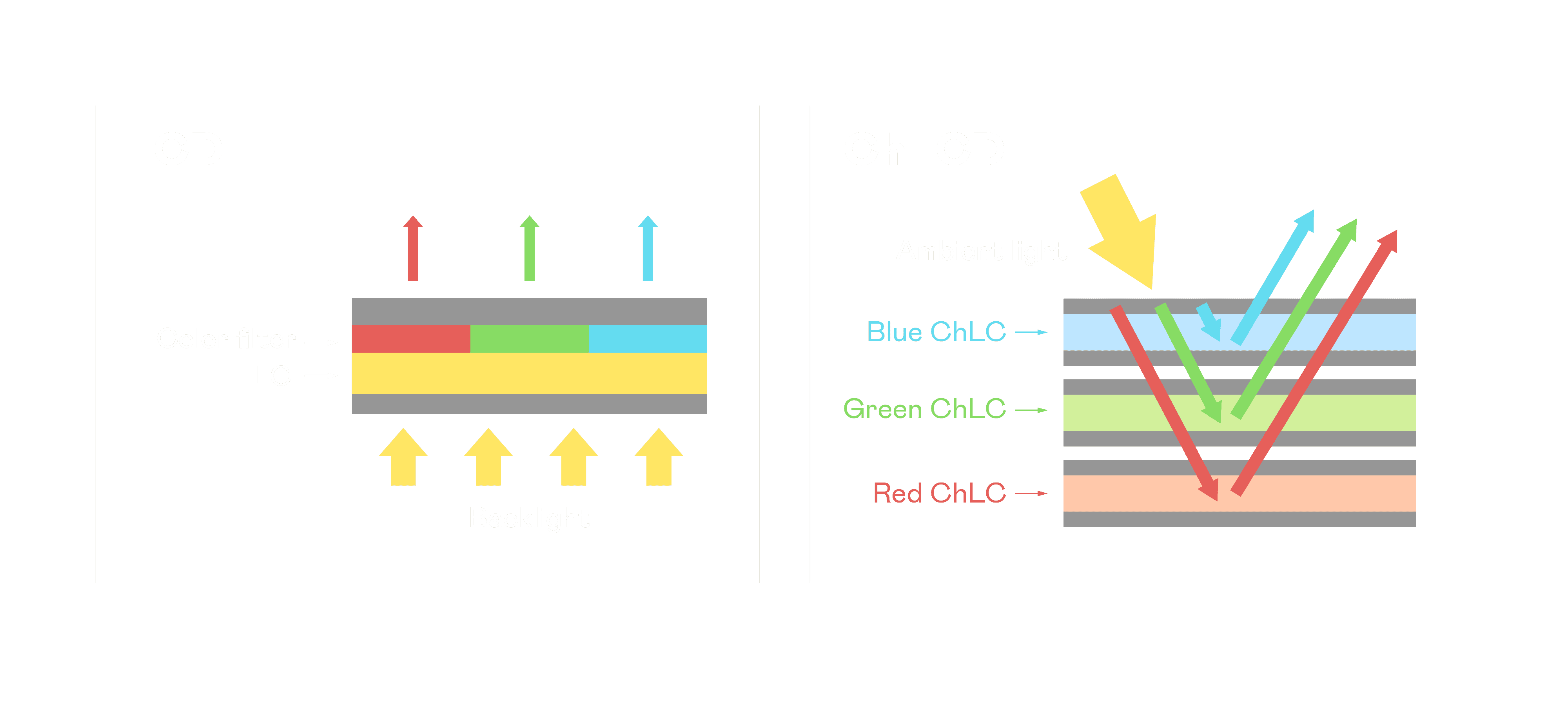 ChLCD 胆固醇液晶就如同纸张一样,,,,透过反射环境光来显示影像,,因此长时间观看不易造成人眼视觉疲劳,,,,可达到护眼效果。。。当处于户外阳光下使用,,LCD 影像容易失真而不易观看,,但胆固醇液晶仍可维持较佳的影像品质。。